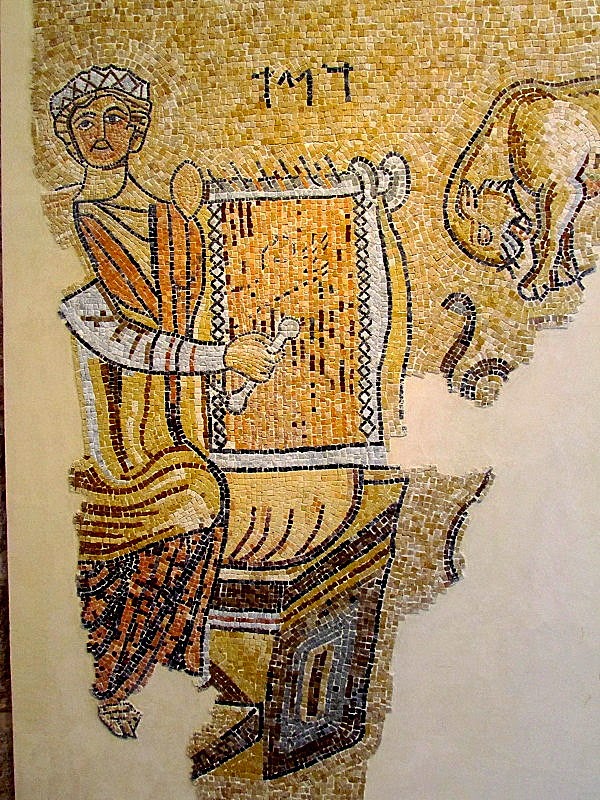 Сохранившаяся часть мозаики из синагоги в Газе. Ориентировочно VI век н.э. Надпись над лирой (на иврите) извещает: «Давид». А сам царь Давид облачен в одежды византийского императора и играет на лире, или, если точнее перевести аннотацию, «на гуслях Орфея».