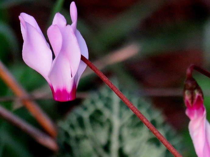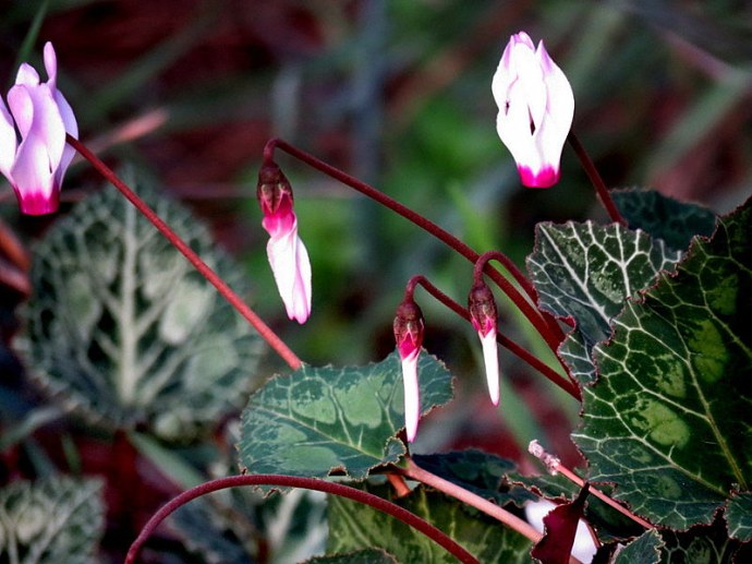 В отличие от леса, где пока цикламены демонстрируют лишь свои узорные листья, в парке они цветут вовсю