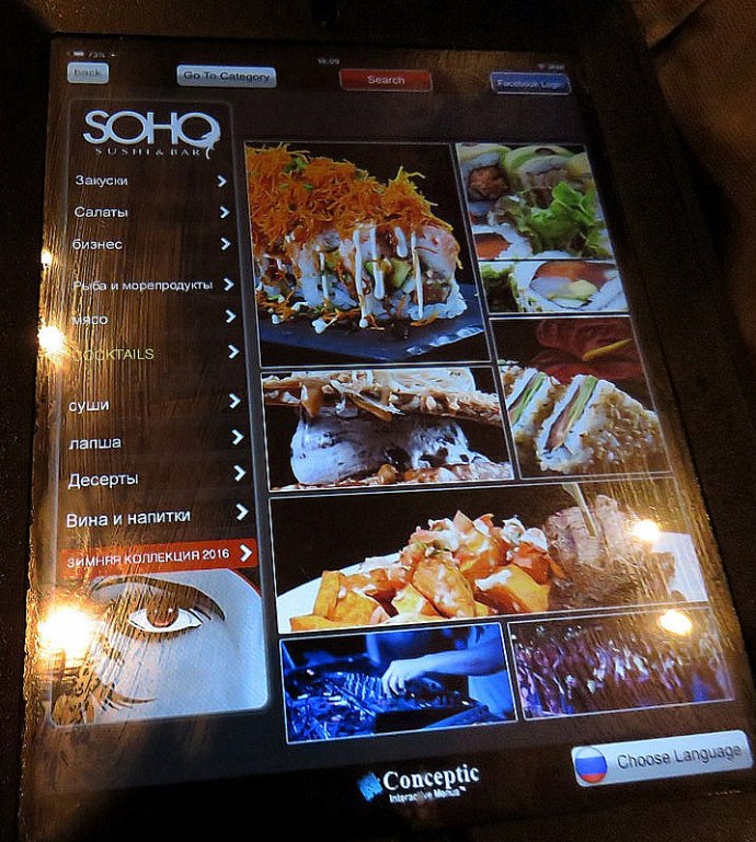 Чтобы не растеряться в выборе: меню можно листать, как планшет, и возле каждого наименования увидеть снимок блюда. Почему это меню на русском (есть и на иврите, и на английском)? Потому что русскоязычные посетители — частые гости суши-бара. SOHO облюбовали также знатоки восточной кухни, гурманы-политики и бизнесмены, а особенно те, кто любит высокие европейские стандарты обслуживания.