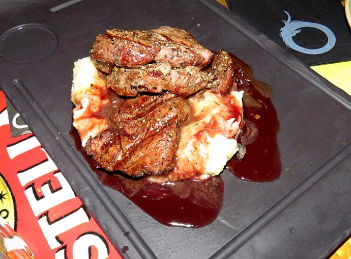 12. Три медальона в соусе из зерен горчицы и сливок в соусе из перца и красного вина, подается с пюре и луковым вареньем.