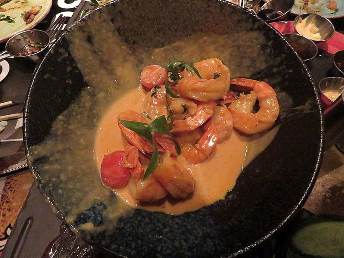 13. Креветки Том Ям — сливки, пармезан, помидоры черри, мята, цедра лимона