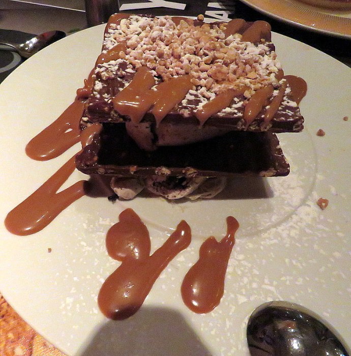 9. Пирамида c кремом со вкусом торта — печенье из воздушного риса, карамели и шоколада с мороженым, с сиропом из сгущенного молока, украшена засахаренным миндалем.
