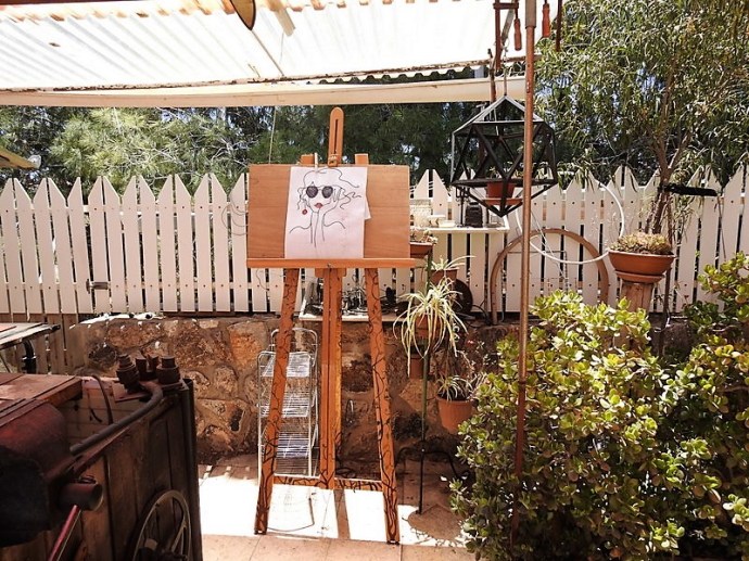 Мастерская под тентом и эскиз очередной работы: