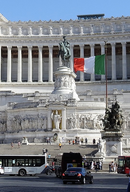 Центральное место в архитектурной композиции занимает двенадцатиметровая бронзовая статуя Витторо Эммануила II верхом на коне: