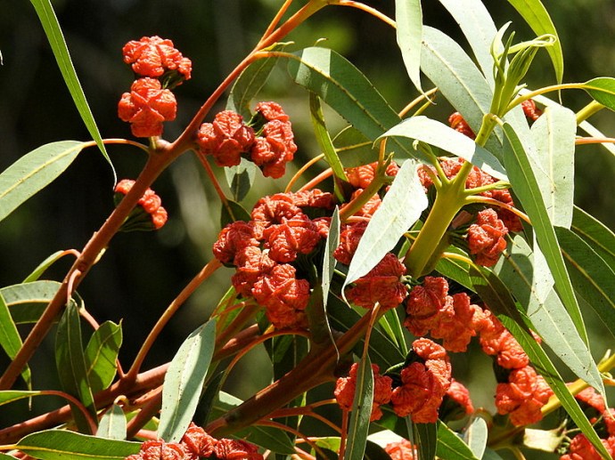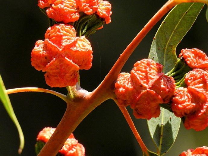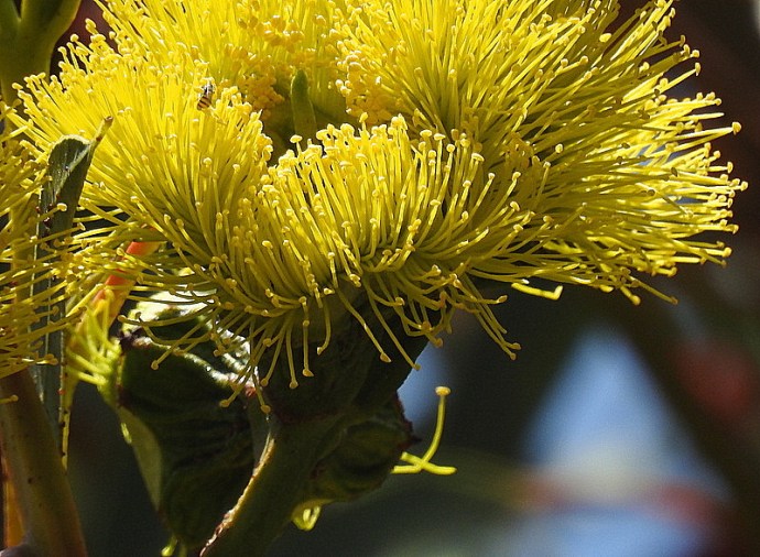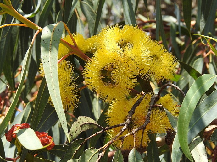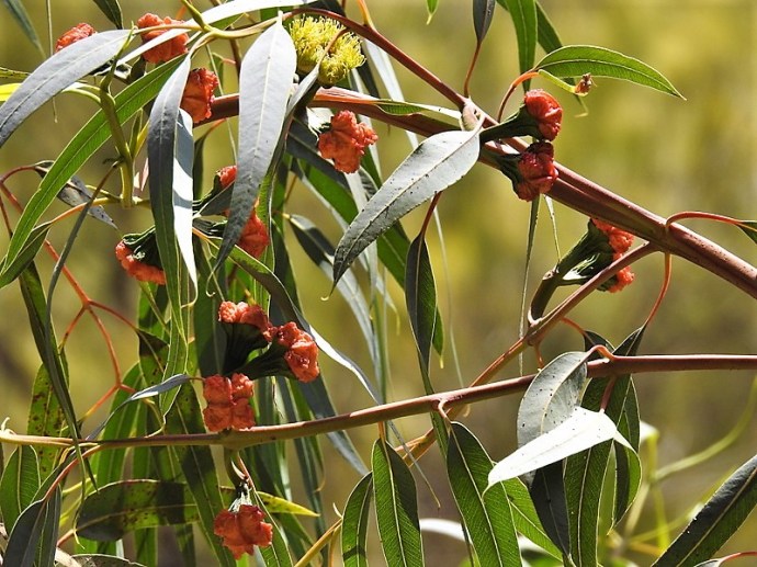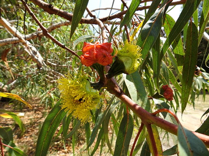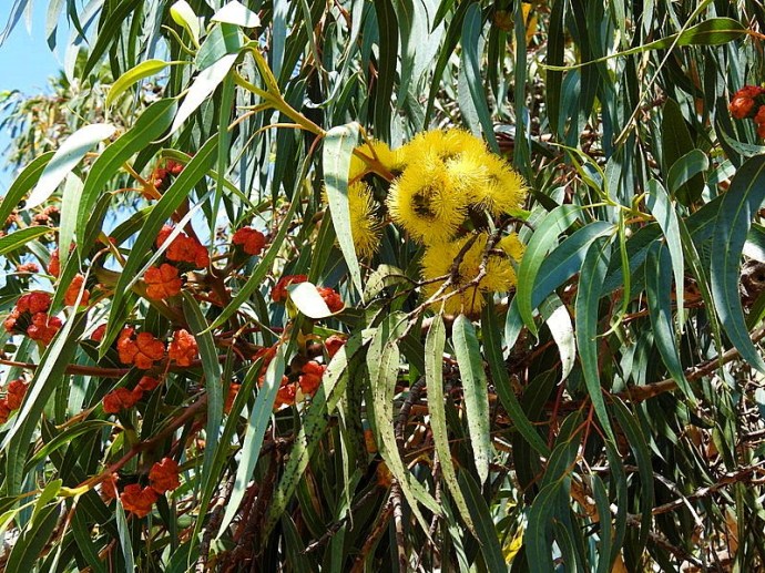 Ярко-желтые цветы и красные бутоны можно видеть на эвкалипте одновременно, что создает феерическую картину красок.