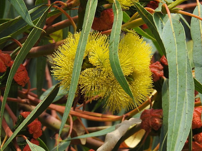 Желтые цветы распустились на эвкалипте, который называют красношлемный, краснотюрбанный, краснопокрытый. И даже «Эвкалипт красная шапочка»… Почему?