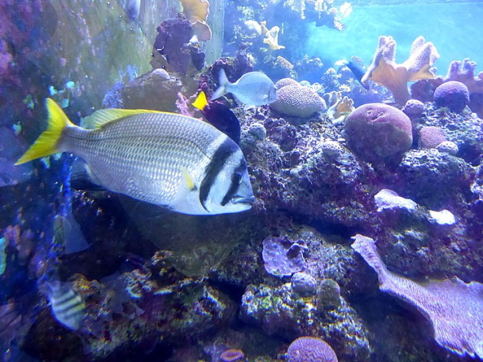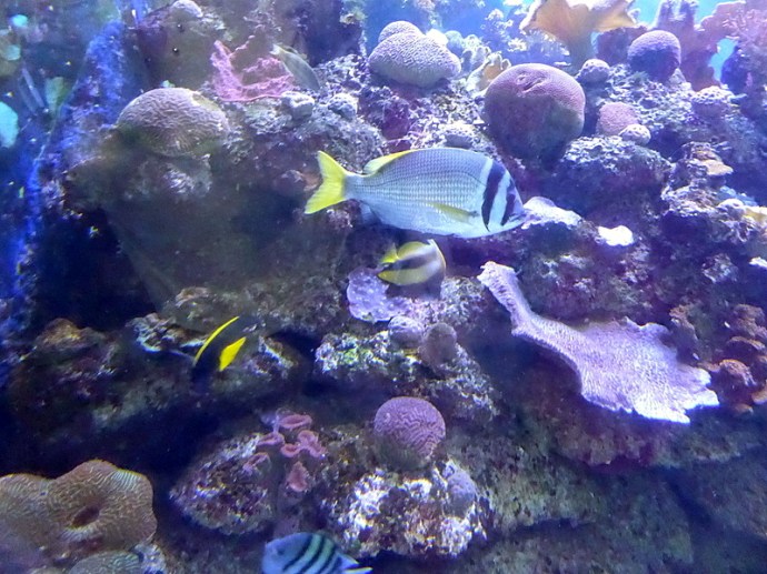 За окнами проплывают пестрые рыбки, украшающие и без того красочный в коралловый лабиринт. В океанариуме 35 аквариумов, в которых можно увидеть более 400 видов рыб.