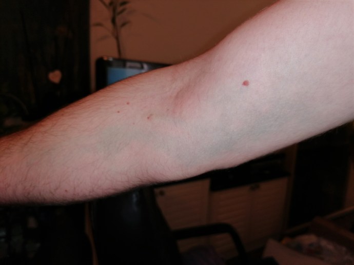 На внутренней стороне рук и ног, возле изгибов, появились такие пятна (?) — сине-зеленые (парню 25 лет). Типа, как просвечивают сквозь кожу. Анализы на кровь и мочу хорошие.